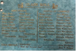 And then on Tuesday, June 12, 1928, Irene joined her 15 classmates as graduates of Notre Dame Academy High School. Thirty-five young women graduated, including 16 high school and 19 commercial school. Reverend John Oldergeering delivered the address, while Monsignor Tappert gave the diplomas. Louise Nuxoll and Angela Oldergeering gave two orations on “The Girl of Yesterday and Today” and “Deeds nor Words”.