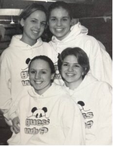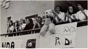 The new mascot was announced at a school wide assembly in February of 1976. Immediately, afterwards, stuffed panda bears began popping up at every basketball game. However, it wasn’t until the 1977 basketball season that a real-live panda appeared on the NDA courts. Dressed in a full-size panda costume, junior Colleen McDermott appeared on the NDA scene, bouncing and cartwheeling across the court. Originally a cheerleader for Newport Catholic, Colleen abandoned the all-boys school, in favor of her own teams.